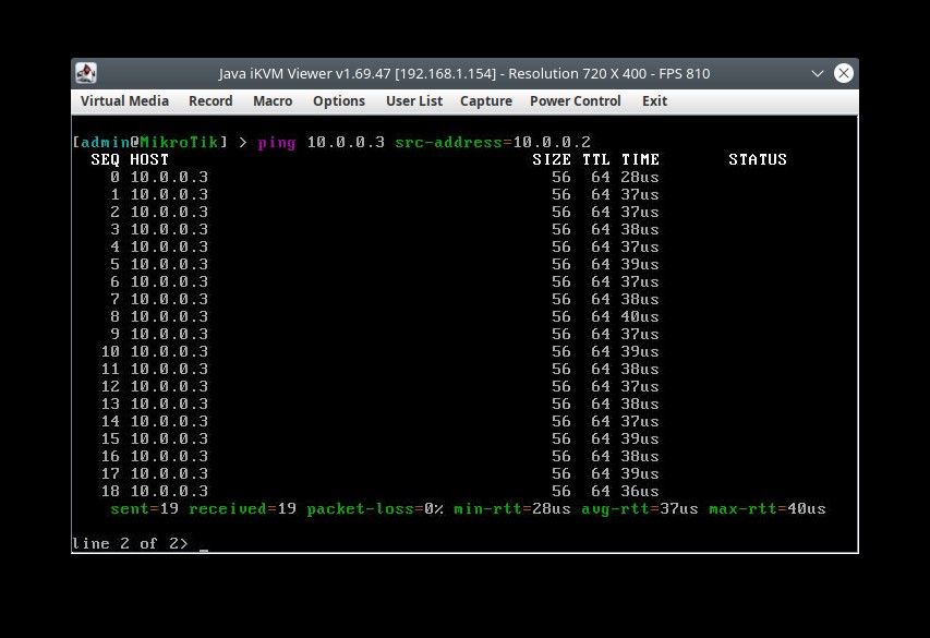 Test ping używając interfejs SFP+ (AOC-STGF-i2S)(ping 10.0.0.3 src-address=10.0.0.2):
